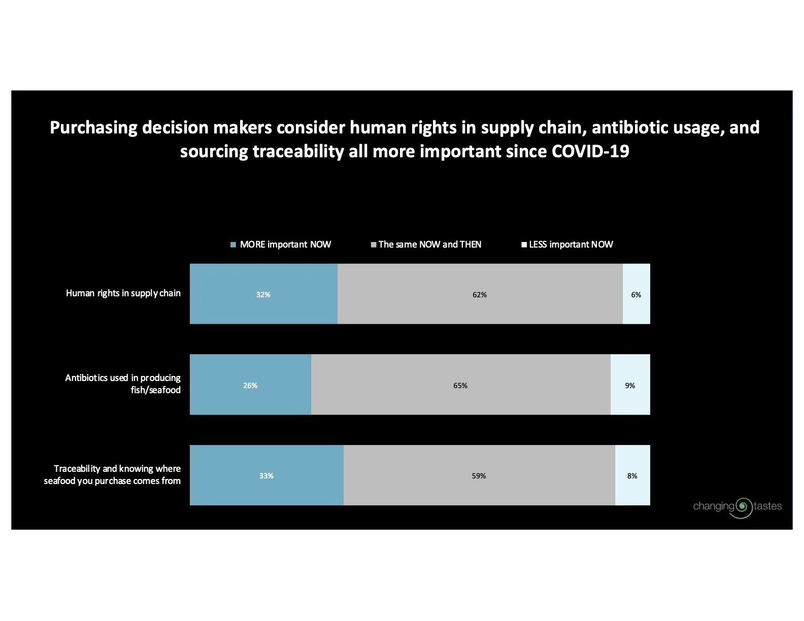 During COVID in 2020 and 2021, public awareness of social equity and global supply chains increased and so did their expectations for companies in the food sector. Issues of human rights in the seafood supply chain along with traceability and antibiotic use all became more important considerations to purchasing decision makers as we seek to align with consumer values and protect the integrity of our brands and businesses.